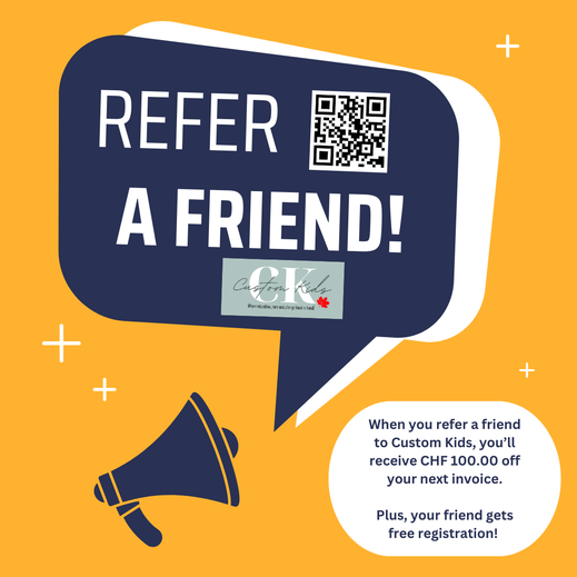 Do you love Custom Kids? Share the experience with a friend! When you refer someone to Custom Kids and they register, you’ll get CHF 100.- off your next invoice as a thank-you. Plus, your friend will enjoy free registration!